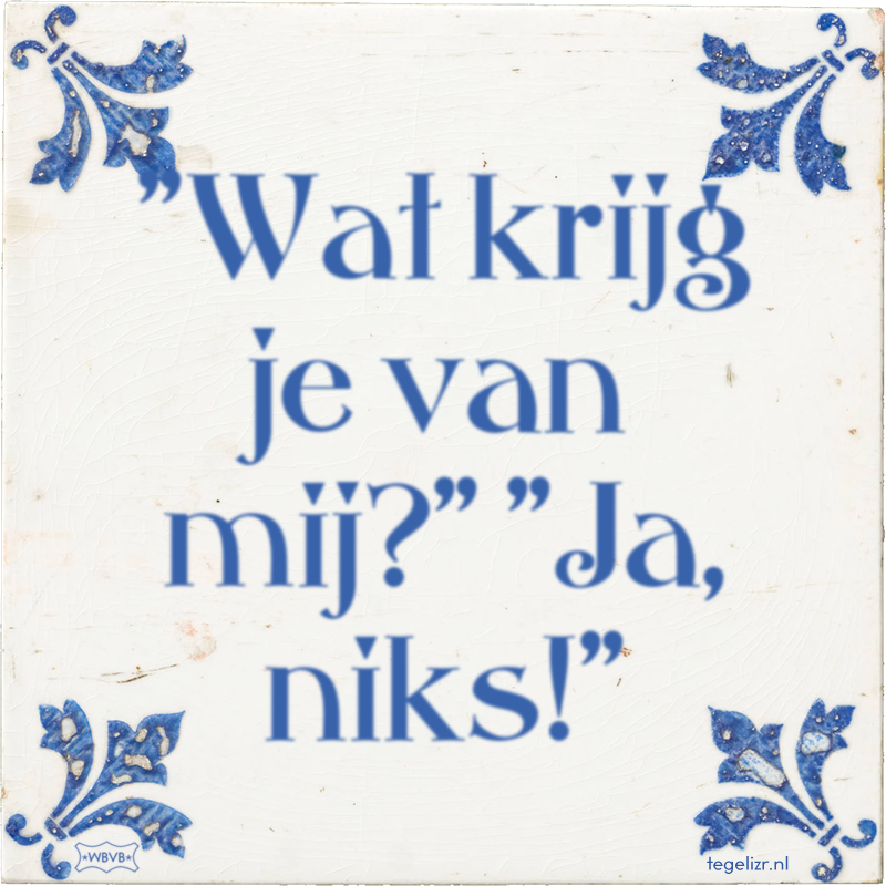 "Wat krijg je van mij?" "Ja, niks!"➮Ej, ik dach' het dus niet, hè?Was ie weer aan het grijnzen?➭ 298 keer bekeken Hoeveel sterren is dit tegeltje waard? 54321 geef sterren Leuk? Of kun jij het beter? Maak je eigen tegeltje. Jouw tekst: Alleen letters, cijfers en leestekens. Maximale lengte 90 tekens bak mijn tegeltje Recente tegeltjes 1 tot 12 You miss 100 of the shots you don't take.Een ding is zeker, niks is zekermagerder woord van het jaar 2025!Cor Z Mister Hoeksche Waard 2025 gekozen door plattelands Vrouwen!Jullie hebben het te snel opgelost!Inspanning heb je in de hand, resultaat niet.Goed slapen is een keuzeJe mag niet eens meer zeggen dat je niets meer mag zeggenWel gelachen ook geneuktEven afgezien van de robots zijn we allemaal menselijkWrok en rancune houden ons staande.Slaap er nog eens een nachtje overvolgende 12 tegels›Bovenkant Bak een tegeltje! Bak een tegeltje! Jouw tekst: Alleen letters, cijfers en leestekens. Maximale lengte 90 tekens bak mijn tegeltje ×